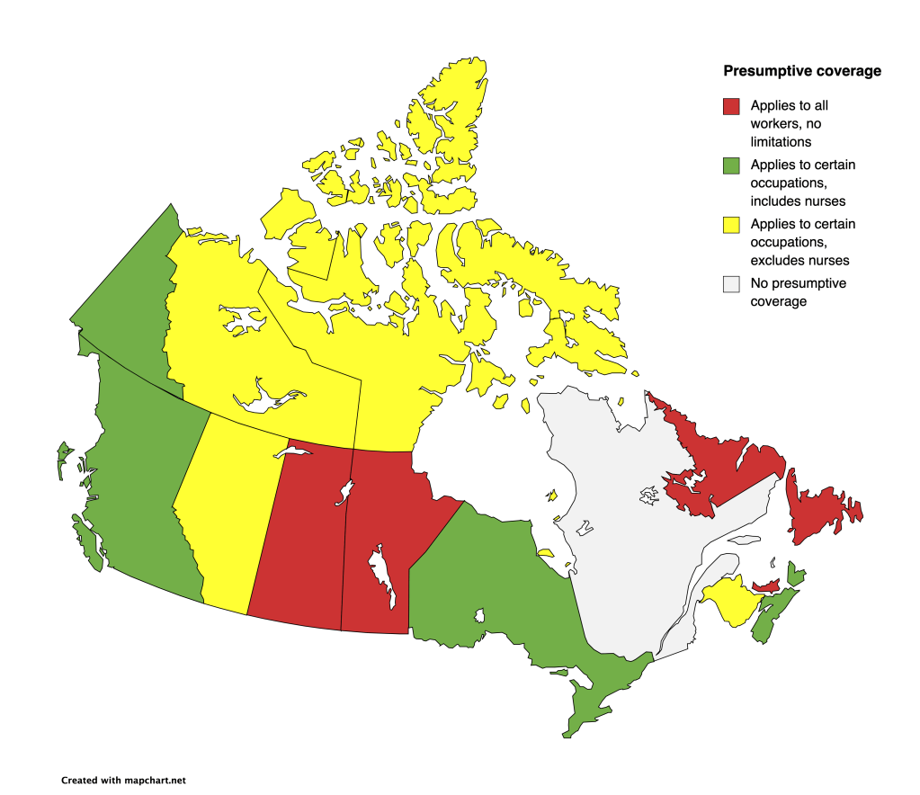 Manitoba has had presumptive legislation for nurses since 2015, and Ontario followed suit in 2018. These provinces recognize that nurses are exposed to significant psychological risk in their work and that presumptive legislation is a vital step in supporting their mental health. By making it easier for nurses to access compensation, these provinces have taken a step toward ensuring that healthcare workers are cared for when they need it most.