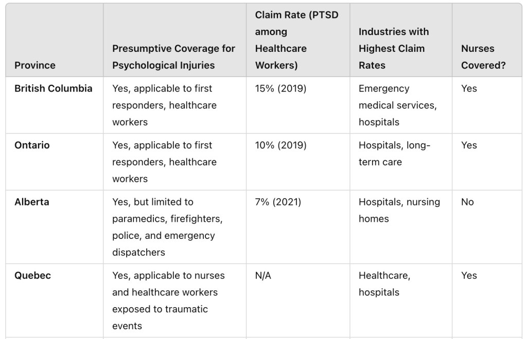 - Impact on Nurses: Nurses are at high risk of developing PTSD and other psychological conditions due to their exposure to traumatic events in their work environments. The availability of presumptive coverage in some provinces (e.g., Quebec, Newfoundland and Labrador, Nunavut) provides critical support for these workers, ensuring they are compensated and can access mental health services in a timely manner. In contrast, the exclusion of nurses from presumptive coverage in other areas (e.g., Alberta, Northwest Territories) can result in delayed claims and more significant challenges in accessing support for mental health injuries.