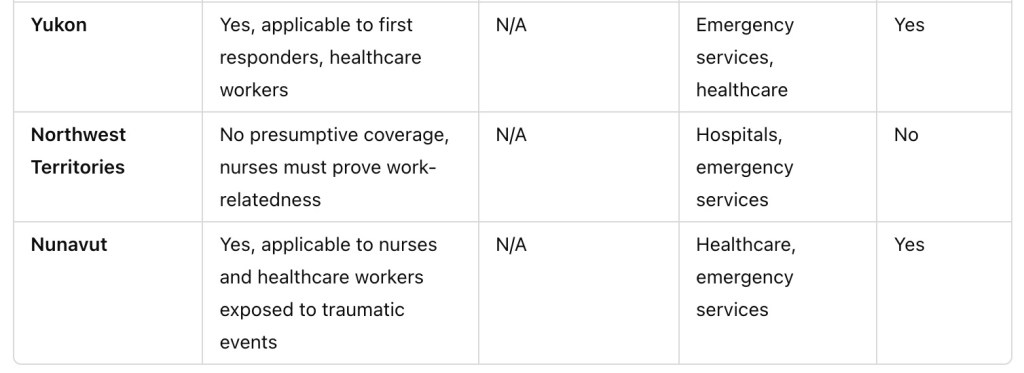 On the other hand, Alberta provides limited coverage, focusing only on certain healthcare workers, excluding nurses. Similarly, provinces such as New Brunswick and Northwest Territories do not offer presumptive coverage, requiring nurses and healthcare workers to prove that their psychological injury is directly tied to a specific traumatic event.